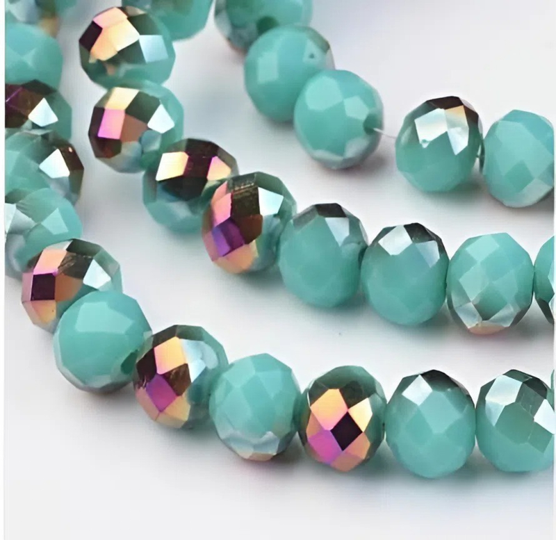 Artikelnummer: K-01 Bak Jasseron Overzicht1 x Streng met ca. 100 Glaskralen Electroplate facet rondelle Half plated- Cyan– 6x 4mm – gat 1 mm