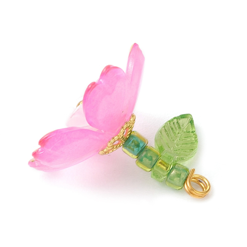 Deze transparante acryl bloem bedels met glazen rocailles en goudkleurige metalen omlijsting zijn mooi om te gebruiken bij het maken van sieraden met een opvallend en decoratief detail. De magenta kleur in combinatie met de fijne glaskraaltjes geeft deze bedels een levendig maar verzorgd uiterlijk. Ze zijn geschikt voor armbandjes, kettingen en oorbellen en komen goed tot hun recht in sieraden die u met aandacht maakt, bijvoorbeeld als blikvanger of als bijzonder accent in een cadeautje.