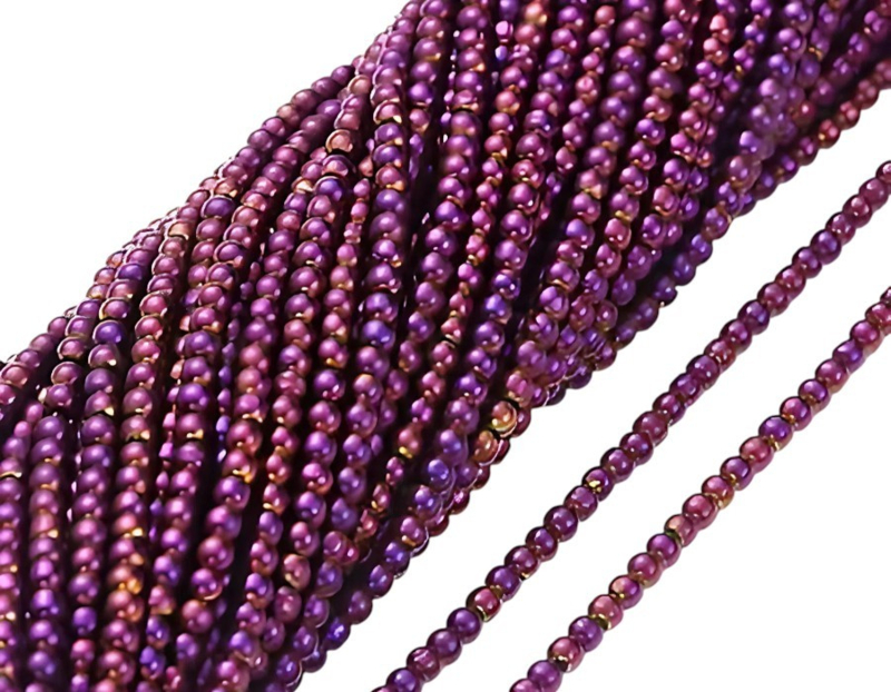 Deze streng bevat ca. 177 ronde glaskralen met een full plated paarse afwerking. Door het kleine formaat van 2,5 mm zijn dit fijne kraaltjes die zeer geschikt zijn voor verfijnd rijgwerk bij het zelf sieraden maken. De paarse glans geeft uw ontwerp een warme en opvallende uitstraling.