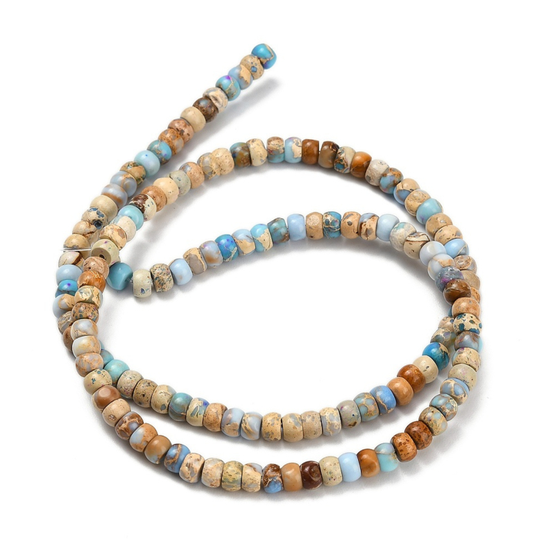 Deze edelsteen kralen van Imperial Jaspis in rondelle vorm hebben een natuurlijke en speelse uitstraling. Met een diameter van ca. 4 mm en een dikte van 2–3 mm zijn deze kralen ideaal voor het maken van verfijnde sieraden zoals armbandjes maken, kettingen maken en andere vormen van zelf sieraden maken. Door hun platte vorm liggen de kralen mooi tegen elkaar aan, wat zorgt voor een rustig en stijlvol geheel. De gemixte kleuren geven uw sieraad een levendig karakter en maken elke creatie uniek. Deze kralen zijn afkomstig uit Peru en combineren mooi met andere kralen en sieraden onderdelen.