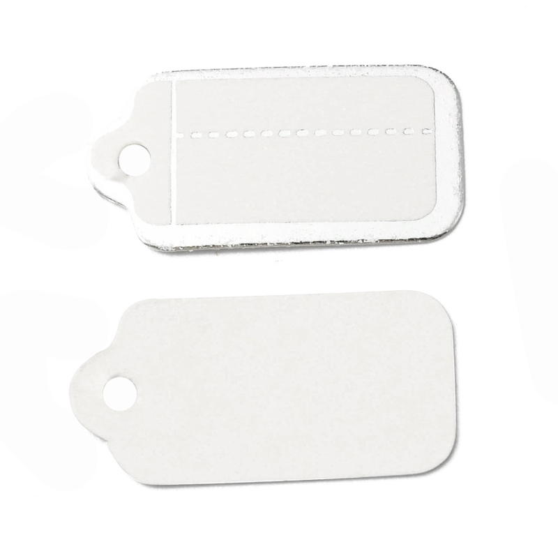 100 x Prijslabeltjes rechthoek 25,5 x 13 mm – koord ca. 10,1 cm – wit met zilverkleurig randje