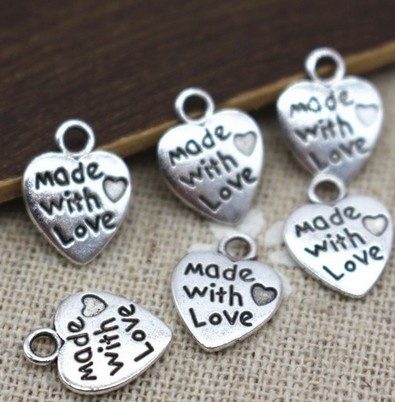 Artikelnummer: Lade 163 Overzicht10 x Metalen bedeltje hartje “made with love” 12,5 x 10 mm – antiek zilverkleur