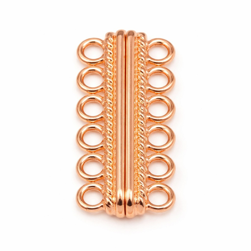 Deze luxe rosegoudkleurige magneetsluiting is speciaal ontworpen voor sieraden met vijf rijen kralen of koord. Met een formaat van 33 x 17 mm vormt deze sluiting een stevig en stijlvol eindstuk voor uw armband of ketting. Ideaal wanneer u bij het zelf sieraden maken werkt met meerdere strengen en uw ontwerp netjes wilt afwerken.