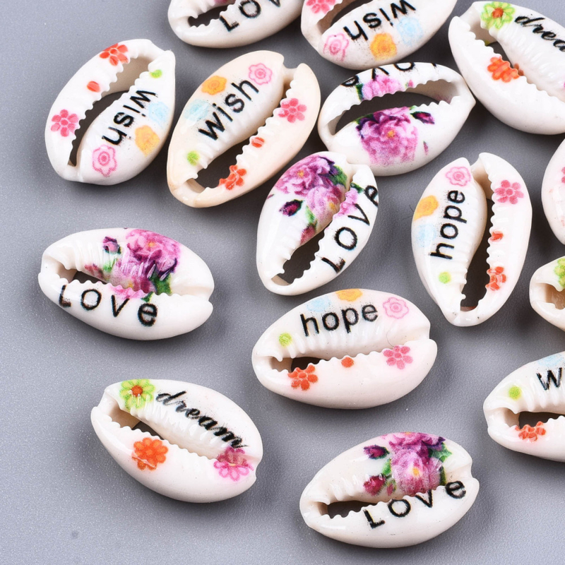 5 x handbeschilderde kauri kralen met woorden mix 18~22 x 13~14 x 6~8mm