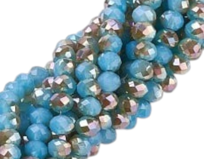 Artikelnummer: H-26 bak armand / J Overzicht1 x Streng met ca. 100 glaskralen facet rondelle briolette kristal 6 x 4,5 mm – gat 1 mm – Light Sky Blue AB Plated / Baltic Sea Blue