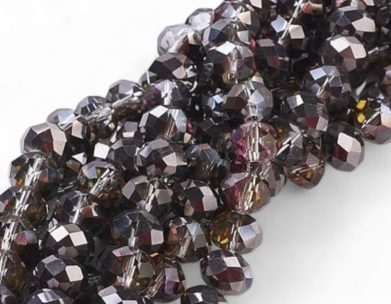 Deze streng bevat ca. 72 facetgeslepen glaskralen in rondelle briolette-vorm. De kralen zijn 8 x 5 mm groot en hebben een rijggat van 1 mm. De diepe zwarte kleur met AB-plating zorgt voor een subtiele glans die uw zelf gemaakte sieraden extra uitstraling geeft.