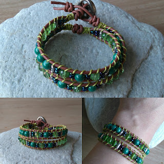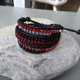 -Haal beide kanten van het draad door de eerste kraal. (Gekruist, dus de één van links naar rechts, en de ander van rechts naar links).Ik begin met één rocaille, en bouw zo op. Haal iedere keer, nadat je een kraal hebt geregen, de draad om het leer heen.