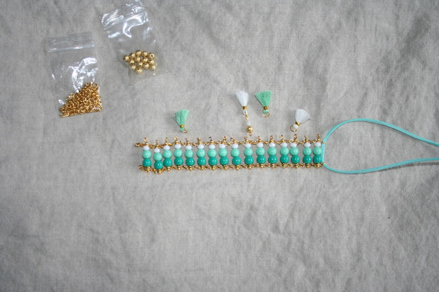 De gecreëerde oogjes aan één kant van de armband, lenen zich bij uitstek voor versieringen. Hang aan elk oogje een korte volle nietstift. De combinaties zoals op de foto’s, maken het af. Zoals hier de goudkleurige stardust-kralen met de kwastjes én de facet glasdruppels met de goudkleurige kraal.