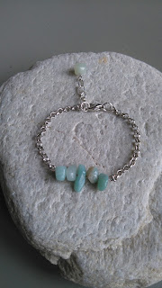-Voor het tweede armbandje heb ik, steentjes op een kettelstift gedaan. Hier stukjes jasseron aan gemaakt. Nog een grovere jasseron als verlengkettinkje, met amazoniet op nietstift. Slotje (met ringetjes) en klaar.