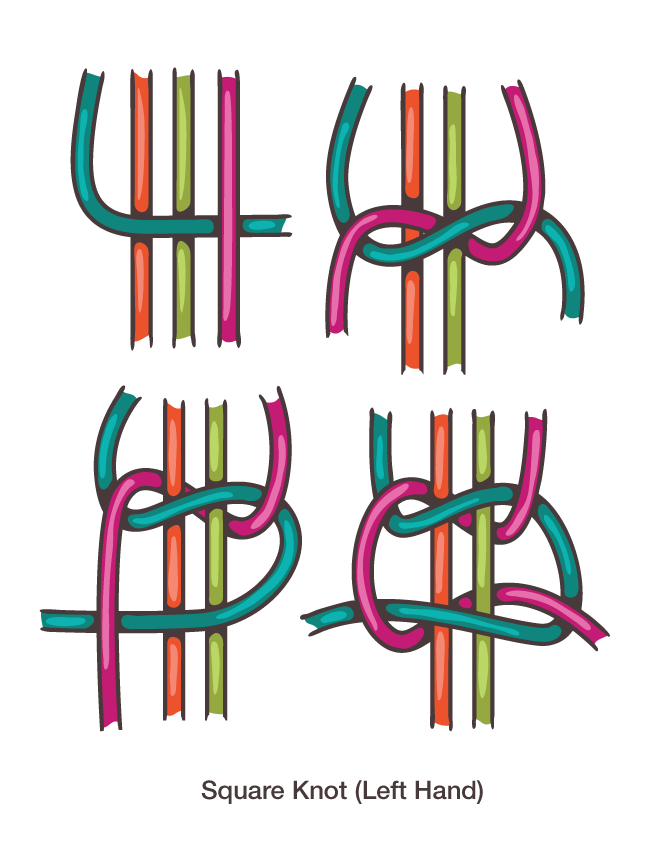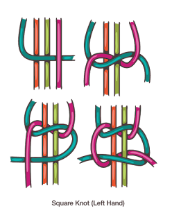 - Vervolgens ga je met de lange koorden de platte macrameknopen maken tot de armband lang genoeg is. (Onderaan zie je een tekening van de macrameknoop)