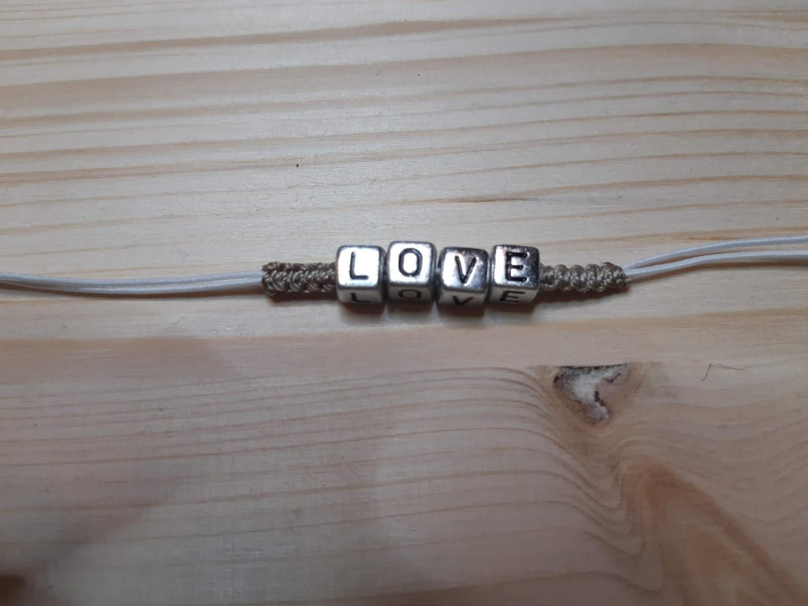 Armband 4: “LOVE” bij deze dubbel waxkoord gebruiken ivm gat van 3.5 mm, eerste en laatste letter vastzetten met macramé touw anders zullen de letters steeds verschuiven bij het dragen..