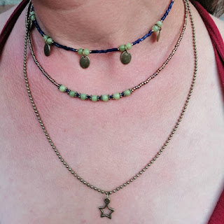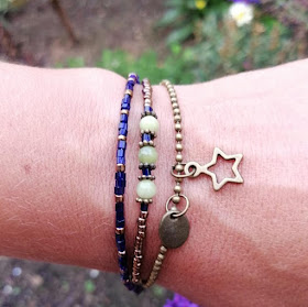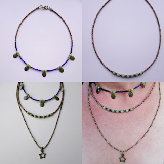 Vandaag deze leuke set gemaakt met de spullen van het Kralenstulpje. Geel koper gecombineerd met Chinees jade en kobaltblauwe kraaltjes. Het zijn drie losse kettinkjes dus je kunt ze ook apart dragen.