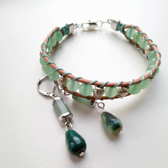 Deze week maakte ik deze prachtige set met onder andere aventurijn. Zelf maak (en draag) ik voornamelijk sieraden met half edelsteen. Het Kralenstulpje heeft veel keuze in half edelsteen kralen. Ik heb voor deze set gekozen voor aventurijn, een zachtgroene steen.