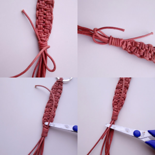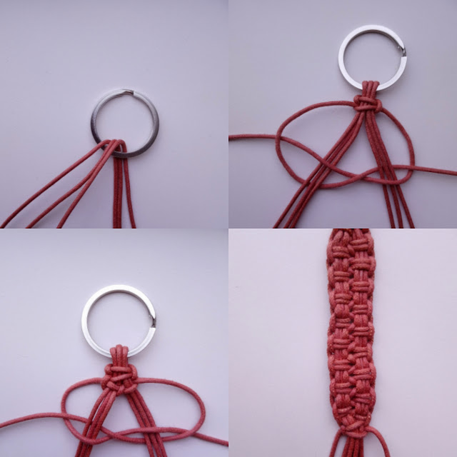 Neem drie stukken van het 2mm waxkoord, en haal deze door de ring. Neem de rest van het waxkoord, om mee te knopen. Eerst knoop je om alle zes de draden heen, dan om drie om drie.