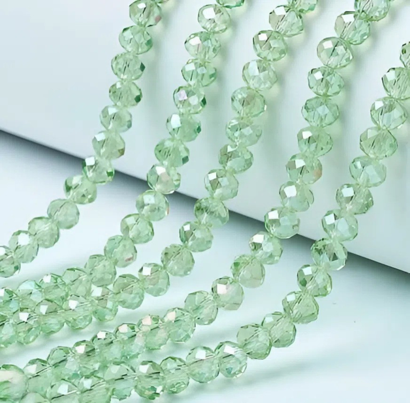 1 x Streng met ca.140 - 145 glaskralen facet rondelle briolette kristal – 4 x 3 mm – gat 0,8 mm – Green AB Plated1 x Streng met ca.140 - 145 glaskralen facet rondelle briolette kristal – 4 x 3 mm – gat 0,8 mm – Green AB PlatedDeze streng bevat ca. 140 tot 145 facetgeslepen glaskralen in rondelle briolette vorm. De kralen hebben een…